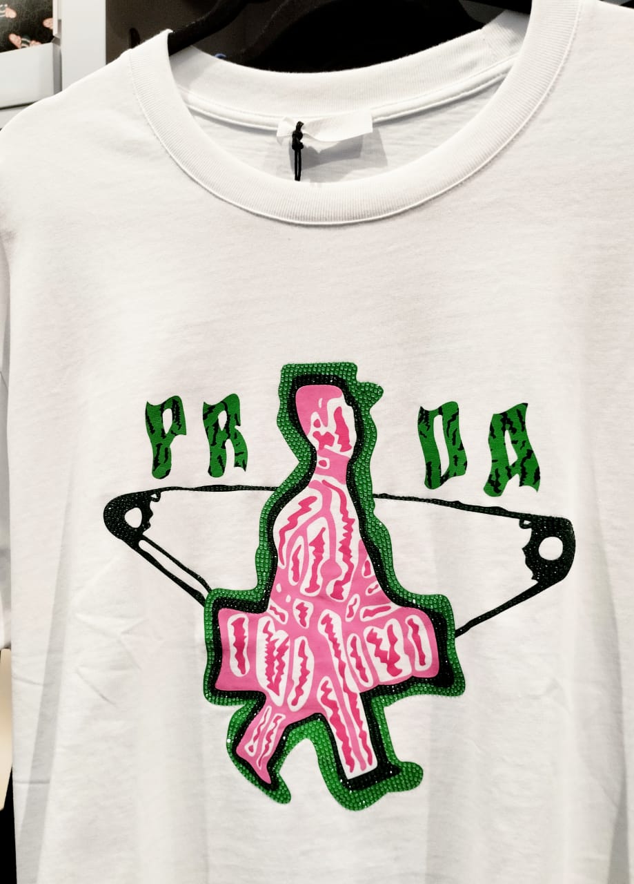 Camiseta prada, 100% algodón, con accesorio en la parte superior del pecho.